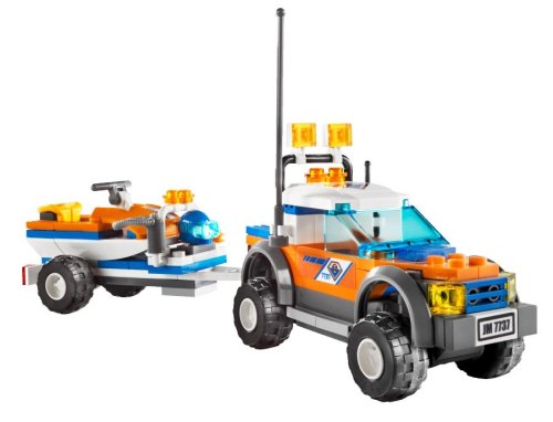 - Includes truck, boat, trailer, diving equipment and Coast Guard minifigure