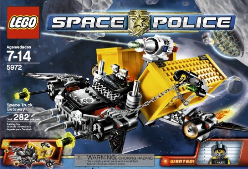 Watch out for the space truck's hidden laser! Emergency alert to all units! Astro-punk 'Snake' is on the loose in the super-tough Wrecker space truck, and he's hauling a stolen Space Police laser cannon hidden in the back. It's up to you to bring him to justice, but look out for the Wrecker's heavy blast armor, twin pulse lasers and spaceship-shredding spikes! 2 minifigures included: alien 'Snake' and Space Police Officer! Alien space vehicle is outfitted with blast armor, twin lasers, front grill spikes! Rear compartment opens to expose stolen police laser! Wrecker space truck measures 10 inches (25.4 cm) long and over 11 inches (27.9 cm) wide! Pieces: 282