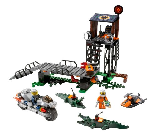 Includes Agent Charge, Break Jaw minifigures, swamp base, rocket-cycle, jetski and 2 crocodiles. Bridge has 2 flick-fire missiles that rotate in all directions. Push the button to activate the secret drop bridge. Swamp base stands 6" tall and 11" wide. 231 pieces.