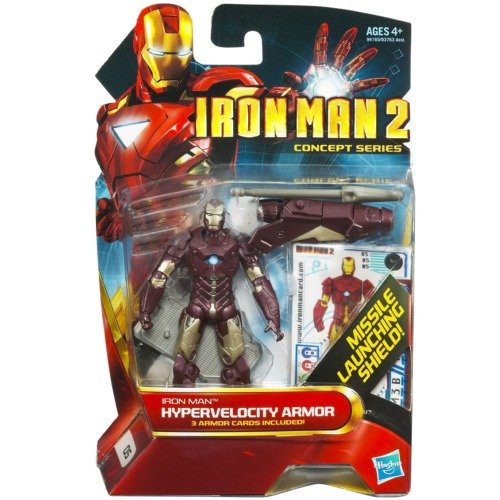 - Iron Man 2 movie 3 3/4 inch action figure collection from Hasbro- Iron Man Hypervelocity Armor (figure #05) comes with missile launching shield and 3 Armor Cards
