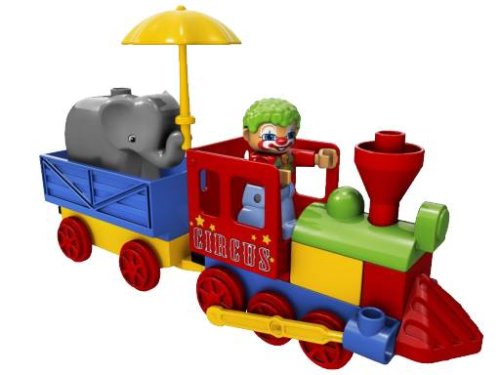 This circus train has a cargo full of fun! Here comes the colorful circus train, complete with a friendly clown conductor and a baby elephant doing its umbrella act. DUPLO bricks are sturdy, safe, and lots of fun for small hands to build, take apart, and rebuild over and over again!