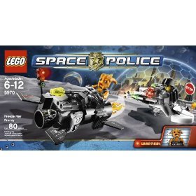 Freeze the space-crook in his tracks! Space Police Command to all available units! Space Biker leader Kranxx is on the loose with his hotrod hover-cycle, and he's breaking every intergalactic speed limit in sight. Hop on your anti-gravity Ray Bike and use your twin flick-fire freeze ray cannons to put his crime spree on ice - just watch out for his cycle's blazing fire trail! Kranxx and Space Police Officer minifigures included! Traffic light and stop sign accessories also included! Space police vehicle has flick fire weapons! Police Ray Bike measures 3 1/2 inches (8.9cm) long! Hotrod Hover Cycle measures 6 inches (15.2cm) long, including fire trail! Pieces: 80