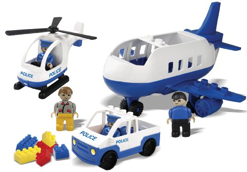 - Contains one Police Car, one Police Helicopter and one Jumbo Jet play vehicle with large building elements suitable for younger kids- Includes four Police Officer play figures with moving arms, legs and head