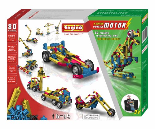 The 80 MODELS is the top of the range in the engineering series and it is the most advanced one. It brings together a broad range of themes and features some very impressive models. The "supercars" theme includes 4 amazing vehicles, a formula one car, an off-roader, a trailer and a combine harvester. The "cranes" theme includes 4 fully functional cranes, a construction crane, a rotating lever crane, a lift and a loader. The "mobile cranes" theme takes modelling to extreme levels and includes several types of forklifts. Many of these models can easily be modified to become operable with the bonus 3V engino geared motor and children can use their imagination to discover ways to optimise such modifications. The motor has a double-action switch and works with 2 AA batteries (not included). The set contains detailed instructions for 12 models and a motorized dinobot, an amazing huge contraption that works with a crank action to move the mouth and the tail of the dinosaur. Instructions for other models can be dowloaded from the engino´s website. ENGINO TOY SYSTEM is perhaps the most advanced and versatile three dimensional construction toy in the market today, offering unique opportunities for creation for both children and adults alike. The toy comprises of a system of multi-faceted rods and connectors that share some unique geometrical features that allow connectivity up to 6 sides simultaneously! In essence, this patent-pending design transforms rods into connectors, leading to builds that may be either dense or with large openings. This feature alone enables children to build fast and easy, simple or complex models, using a very low number of different components and a much lower quantity of parts.