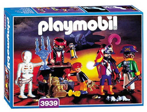 The four pirates with their parrot are a fearsome group. They are always on the lookout for treasure, and are well-equipped for any job with entering hooks and weapons. Evidence of their past successes is kept in their locked chest, which contains coins, a sculpture, goblets, and a candlestick. In the soft light from the hand lantern a skeleton glows eerily as two mice frolic nearby. Pirate Crew comes with a detailed crew and an open/close chest. This Pirates set complements items 3285 and 3286. Recommended for ages 4 and up.