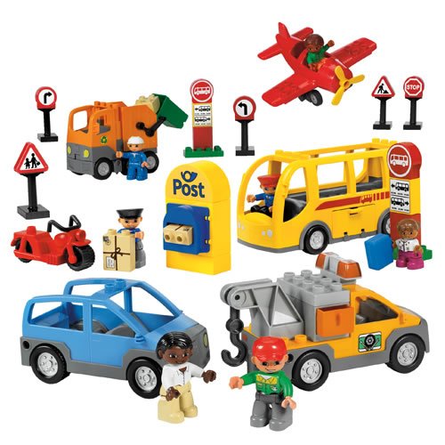 Set includes 56 pieces including road signs, a waste collection vehicle, airplane, bus, bus stops, DUPLO figures and much more that will inspire children to explore a wide range of real-life vehicles, the roles that they play within the community and the people that use them. Ages 2 & Up.