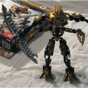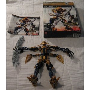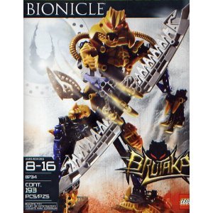 Once he was a loyal guardian of the Matoran and Axonn's best friend, but now he has turned evil. Powerful enough to defeat six Toa with one blow of his double-bladed weapon, Brutaka alone is as great a threat as all the Piraka combined. He wears the Kanohi Olmak, the Mask of Dimensional Gates, which can be used to transport a target to another location or even into another dimension. Brutaka stands over 10" high and includes gold-colored armor and elements. His double-blade is 10" long. Includes Mask of Dimensional Gates. 193 pieces.