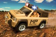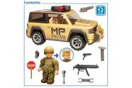 Features military police figure. SUV has working lights and accessories include: weapons, handcuffs, stop sign and a walkie-talkie.