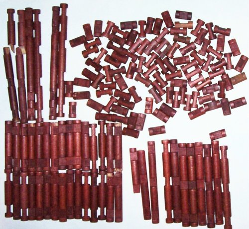 - total 64 pieces original lincoln logs by K'Nex, This set contains thirty-six 4.5cm (1") logs, Four 12cm (4.5")round logs, twelve 19.5cm (7.5")logs, Two 27cm (10-3/4") logs, and ten 12cm (4.5") flat green color roof slats. 64 piece logs in plastic bag packaging.See more technical details