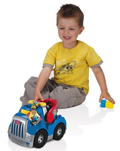 Haul big loads of blocks with this durable tow truck that features rolling wheels and a push-along handle. The truck's back door opens and works as a ramp for hauling and towing disabled vehicles. Works with Tiny 'N Tuff Vehicles and Mega Bloks Lil' Vehicles, sold separately. Comes with 24 Maxi blocks. Measures 18"L x 12"W x 12"H.