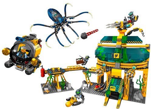 - Includes 4 diver mini-figures, giant squid, skeleton, vehicle dock, control station, crane, launching ramp, firing rocket, and pod